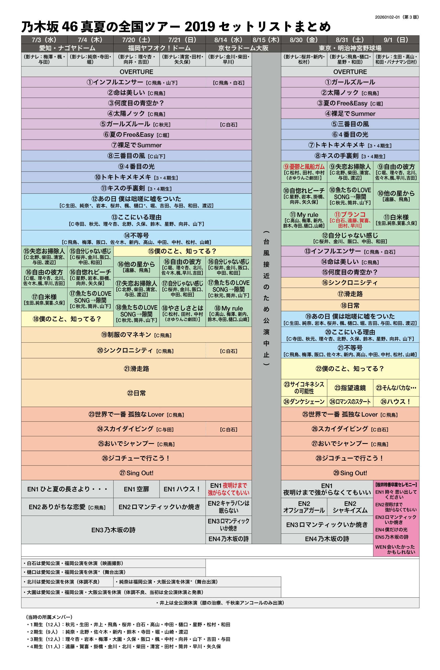 - (メモ2)泣いたっていいじゃないか?/孤独な青空/羽根の記憶は、31stシングルType-Dに収録された東京公演の模様(3曲とも収録あり)から、曲目問わず全公演メンバー固定(センターのみ変更)・休演メンバーの補充はなし(cf. 東京公演での掛橋)と判断。
